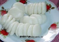 白糍粑,糍粑之一。此食品是逢年过节的特有食品。它是以上等糯米为原料,将糯米掏洗净后浸透,放入蒸笼内,蒸至熟软松化。捞出放入石舀内,两人用木棒捣碎后上锅蒸。将蒸熟的糯米饭捣烂成软韧的糍粑,捞在盆内,趁热分成小团,再将小团捻扁成圆形,每个糍粑厚约一公分,直径一般15至20公分。婚嫁用的,则做到30至40公分,还要在白糍粑上剪贴“龙凤呈祥”、“吉祥如意”等字样。如将白糍粑放入碱水内,可保存数月,随时可取出洗净食用,汤煮、煎烤均可。此食品具有美味香甜、松软爽口等特点。