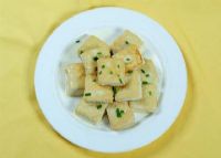 马山豆腐的食谱包括豆腐花、无心豆腐块、豆腐圆、三角豆腐、鱼头焖豆腐等。无心豆腐块的做法是最简单的:撒些许盐,烧热锅里的花生油,然后放入已切成块的豆腐,再撒些许盐,转文火慢煎,稍黄后翻煎,待两面都稍黄了铲上碟子,撒些葱花即成。注意,千万别把葱花与豆腐同煎。