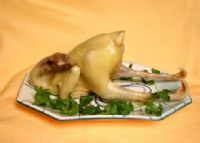 (1)将鸡宰杀干净放在滚开汤锅内浸汤熟(不宜过熟,一般15分钟左右)。浸鸡期间要提出水面两次,即每隔5分钟一次,提出后立即倒出鸡腔内的水,复放锅中,以保持腔内外水温一致,使之均匀致熟。取出后切成块,盛入餐盘中装上头翅,拼砌成鸡形。