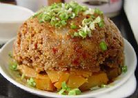 3、炒锅置火上,下油烧至七成热,将晾冷的粉蒸肉片拌上鸡蛋浆,沾满干面包粉,下油锅炸至金黄色捞出,装入盘中,撒上椒盐即可。