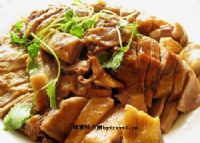 2、旺火烧水,加适量咸盐、姜、蒜(拍碎),水温至80度时,将鸭放入水中烫过,然后慢火浸煮,水温保持微沸而不太滚,至鸭将熟时(以鸭身有弹性, 用筷子往鸭腿上端戳进肉内而不冒血水为度)捞起,待自然冷却后斩件装盘,砌成整鸭形状上席。