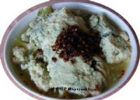 4、用酸菜汤点浆这个过程与点豆腐的过程是一致的,只是菜豆腐用的是酸菜汤而不是石膏粉。一般1.5-2千克黄豆制作的菜豆腐要用酸菜汤大约2-2.5千克,关键在于酸菜汤酸的程度。待到汤水看起来好象跟菜豆腐已经分离时即可食用。