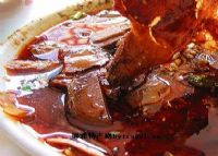 卤牛肉时将牛肉煮成耙而不烂;切牛肉时应横着筋纹切片