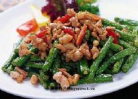 四季豆300克,肉馅30克,冬菜末10克,葱20克,干虾仁10克,姜末5克,盐1/2匙,糖1匙,味精1/2匙,料酒1匙,香油1匙,醋1/2匙。