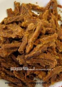 该品选用冬瓜牛肉切条,生条寸多长,先将血水漂净,经煮、卤、炒而成。制作时火候颇为讲究,煮至条肉断血即可,卤至条肉表面纤维收缩为度,炒作时至条肉表层疏松发毛,并作最后一次调味,然后起锅晾冷即可食用。煮卤火候不到则不发毛,过火则烂碎。此品以色泽棕黄,松软化渣 ,咸淡适度,醇香味长而闻名。即可佐酒,又可零食,携带方便,保质期长,实为旅游佳品。
