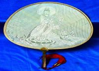 自贡竹丝扇是四川省自贡市久负盛名的特产,是我国工艺品中的一颗璀璨明珠。自贡竹丝扇编织技艺由清代末年的龚爵五始创,因而自贡竹丝扇又被称为“ 龚扇”。自贡竹丝扇扇面为桃形,是用细如绢丝的竹丝精心编织而成的。自贡竹丝扇颜色嫩黄,灿若云锦,薄如蝉翼,图案或山水人物,或花鸟虫鱼,无不形象逼真,维妙维肖,配以象牙或者牛骨做的扇柄,丝质扇坠,确是精美绝伦,堪称国宝。