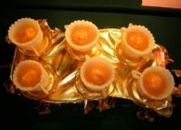 大米吊浆粉子煮熟后擂成团,做成每个重15克的剂子,将剂子按扁包入馅心,封口向下捏5个花瓣压上花纹,中间安上红、黄两色花蕊,入笼蒸制即成。fKw