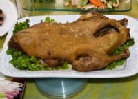 射洪香酥鸭,外表焦黄,十分酥脆,入嘴即化。鸭皮自然是其中精华,香,嫩,微带韧性,回味无穷,全在一个韧字上了。鸭肉成丝,轻轻一咬,可以撕开来,有别于其它烤鸭的油性十足,反而以香酥取胜。