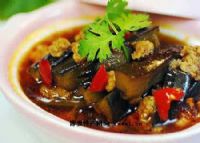 3.热锅置入色拉油烧至6分热,先把茄子下锅炸过,倒入漏勺沥干油分,原锅留点色拉油下肉末、蒜末、姜末爆炒,再入辣椒酱加一勺清汤,把茄子倒入加调料糖、味精、酱油闷烧待汤汁快干,勾芡加醋、葱花淋明油即可。