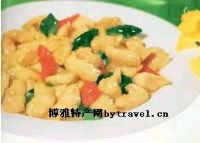 白、绿、红三色相间,咸鲜嫩滑,微辣爽口。