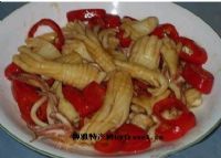制法:鱿鱼洗干净中间切开成一整片,上半部门切十子刀,下半部分切条状,红辣椒切成环状,先把鱿鱼放滚水中灼至翻卷成扫把状捞出过冷河,辣椒下油锅炝炒,加入鱿鱼,用蚝油/盐/生粉水勾芡即可。