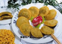 玉米粉加入白糖,用开水调匀后揉至均匀无籽粒,搓成条,切成圆饼,再用擀杖擀成厚1厘米的饼状,入五成热的油锅中炸至色泽金黄、玉米饼炸泡时即成。