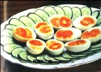 3、选用质量合格的新鲜鸭蛋,洗净、晾干。手持竹片(长13厘米、宽3厘米、厚0.7厘米),对准蛋的纵侧从大头部分轻击两下,在小头再击一次,要使蛋壳略有裂痕,而蛋壳膜不能破裂。PMJ