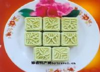 宜宾县的柏溪潮糕,历史悠久,遐迩闻名,据说其还是市场竞争的产物。由于柏溪镇地理环境优越,在清朝同治帝时便是水陆交通发达的码头,镇上商店多,为了占领市场,赢得利润,于是争相改进糕点的生产技术。集义糖果铺的谢德芳根据自己平时研究食品的经验,与当地中医食品名士共同研制而成了柏溪潮糕。谢德芳不知道会两百年后的今天,柏溪潮糕已是家喻户晓、成了馈赠亲友的佳品。潮糕是用绿豆淀粉制作的粮果食品,其形方正,上面有独特的纹饰,洗沙的紫红再配以绿豆的莹绿,两色自然相映,令人悦目赏心。9i7
