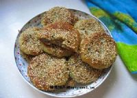 (9)烘烤:将沾好芝麻的麻饼生坯摆上烤盘送入烤炉,用中到大火烘烤3至4分钟后取出,小心在盘里翻面后再烘烤约2分钟左右即可。