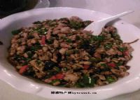 开火,上锅,锅里倒稍微多点油,油温90大概度时就可以把A倒进锅里大火迅速翻炒至6、7成熟时加入B,继续翻炒半分钟,然后放进一整袋(100克)碎米芽菜,大火翻炒一分钟。