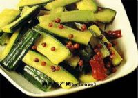 3、炒锅加油置火上,放入花椒,炸出香味后捞出,下干辣椒,炸呈棕红色,将锅离火,再放入黄瓜条,翻炒均匀,加香油,起锅装盘晾凉,浇上调好的味汁即可。
