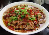4、把肉片滑入鍋中的水中,撥散開,斷生後撈起來放在剛才的菜上面,鍋中的湯也倒入碗中,不要太少,以不要莫?肉片為準。