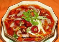 8.将牛肉片放入烧开的汤内,大火煮至牛肉熟透,倒入汤碗,撒上辣椒段、花椒末。