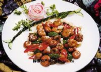 炒。锅洗净盛油烧热,投入姜、葱制一下用 漏勺滤去不用,接着下大蒜片、肉片、青椒稍炒一下,再放入紫花菌同炒,待熟后烹入用盐、胡 椒粉、水芡粉、高汤兑好的汁翻炒几下,即起锅装盘。