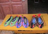 彝族纳的鞋底,一般是用多层的旧布叠缀一起,用自制的麻线上蜂蜡纳缝而成,它让人走起路来轻便起脚,使脚底感觉舒服。鞋面也称鞋脸,造型有圆口、方口和尖口之分。鞋面布的颜色黑、红、绿、蓝都有,鞋帮和鞋面上绣满了各色的花朵植物。走路时,脚面上的花朵在绿色的田埂上跳跃,脚停下不动时,就象地上开出了朵朵野花。