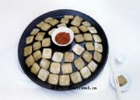 现成的豆腐干有炒食、炸食等多种吃法,烙锅豆腐就是其中最为常见的一种。小城的大街小巷不难发现这样的小摊:铁炉子上支个烙锅,小板凳围在四边,嫩黄的臭豆腐在烙锅上烤着,掌铲的多是些大妈、大嫂。大姑娘、小媳妇们上下班的路上总会在路边的摊摊上要上几块。烤好的豆腐干,佐以辣椒、花椒、食盐等调料,味道更为鲜美。客人边吃边聊着家常,摊主则在一旁不时地给豆腐抹点菜油、翻动着已经烙好了的豆腐。就是在这样的小摊上,人与人之间的距离拉近了许多。