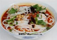 怪噜粉:制作怪噜粉的佐料很多,有酸菜、香菜、葱、花生、折耳根、海带、葱果、榨茶、芹菜、绿豆芽,还有自制的软哨、香菇豆炖鸡、青椒肉沫。