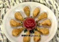 将香菇、鸡肉、火腿、猪腿肉、荸荠分别切成松子粒,加入上浆虾仁、青豆、葱花、姜末,加味拌匀成馅,分成10份,把猪网油切成10张,鸡蛋、干淀粉调成稀蛋糊,涂在网油上,中间放馅,包成鸡腿状,在窄的一端插入一根鸡骨,共做10个。锅置旺火上,放入猪油烧至六成热,将鸡腿上蛋糊放入炸熟,捞出沥干,摆在盘上即成。