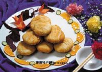 鸡肉饼是贵阳地区著名的风味小吃。饼选用上等面粉制成,用油炸至外形呈橙黄色,饼皮酥脆,正面显现老虎斑花纹式样,背面显现菊花状。馅选用公鸡嫩肉、香菇、虾米等多种原料配制。皮薄馅嫩,香气扑鼻,令人百吃不厌。