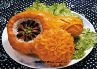 技术要领:香米入南瓜后放水要适量,米要炒干炒香,南瓜的形状要好 。( 贵阳)