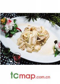 原料:  山药150克,鲜蚕豆仁150克,白糖300克,猪油100克,猪肥膘肉100克。调料:  蜜瓜片、桔饼、核桃仁、红枣樱桃、水芡粉等适量。刀工成型:  山药削皮洗净上笼蒸 、鲜蚕豆仁去皮。上笼蒸烂熟,红枣、樱桃去核去籽,猪肥膘肉捶茸,山药、蚕豆分别捣成茸泥,将山药泥加水芡粉、白糖100克、肥膘泥一半调匀;蚕豆泥也照前法调和,分开盛装。烹调方法:  炒。锅内放猪油分别将山药泥、蚕豆泥炒至翻沙,分装入盘中摆成“太极图”形状,用红枣两颗或樱桃二颗嵌在图上,将桔饼、瓜片、核桃仁、红枣、樱桃切碎,拌入白糖,撒在“太极”上即成。   风味特色:  色鲜美观,香甜绵软。( 贵阳)