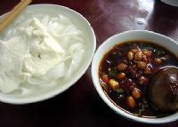 豆花粉迄今已近百年之久。豆花粉味道的好坏,关键在肉梢。清朝末年,豆花粉是一种素食,后来经过改进,加上了肉梢。肉梢是用猪腿筋肉和猪肉切成肉丁,然后用榨菜丁,拌上适量甜酱、胡豆瓣酱等,再用猪肉和菜油各半的混合油炒熟,加上几颗香酥的花生米,放入小碗内,再佐以辣椒、酱油、味精、葱、姜、香菜等的香料。煮粉也是有讲究的,要用豆浆煮,味道比较鲜美。还要备有一锅干净的豆浆,做汤用。吃时,可以选择干吃蘸着蘸水,美味无比,还配有一碗豆浆;也可以选择有有糖的吃法,就是将豆花粉和豆浆混合,在倒入做好的蘸水,也很美味,不过建议干吃。
