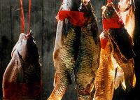 台江腌鱼是苗家待客的传统佳肴。它色鲜味浓,吃起来爽口畅心。苗族人民习惯在稻田里放养鲤鱼,将捕捞得的鲜鱼洗净,剖开取其内脏,然后撒上适量的盐和辣椒粉,再和上花椒面等佐料浸渍,置于烟火上烘至半干,再把备好的甜酒抹上,或糯米粉放在鱼上面,一层鱼一层甜酒糟,装进坛内盖好,封严。等到半月以后,就可取出来用油煎吃,也可生吃。隔年腌鱼,鱼刺已软柔,鱼内甜辣、咸各味兼有,食之别有风味。