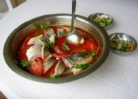 制作过程:将鳜鱼宰杀刮鳞、去鳃去内脏洗净,放入锅,加酸汤、广菜、番茄片、青椒片、姜丝、蒜瓣、木姜子、花椒粒、盐5克,放猪油上火煮熟即成,用煳辣椒面、姜末、葱花、蒜泥、薄荷、盐5克加酸汤调制蘸水(10份)蘸食。
