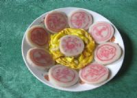 花甜粑的外形平淡无奇,与各地年糕似乎无甚差别。但你只要将条状的花甜粑横向切片,就会惊讶地发现,每一片都是红花绿草,鸟兽虫鱼,而且片片相同,好像克隆的一般,令人称奇。花有牡丹、月季,草木有松枝、幽兰,此外还有翩飞成对的蝴蝶。也可做成“福”、“禄”、“寿”、“喜”等字,一双巧手,变化随心。