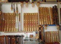 制作要求更是严格,从伐竹到制成有几十道工序。最后在箫笛表面刻以诗画。管身的古铜色彩刻上各种图案、诗词更显得古朴典雅。玉屏箫笛中尤以"龙凤屏箫"最受欢迎。它是雌雄成对的策管。雄的略粗,雌的稍细。吹奏起来雄箫音浑厚洪亮;雌箫又音色圆润含蓄而隽永。雌雄合奏,好似一对情侣在合唱,是那样的协调和谐,娓娓动听。"