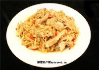 傣族人善于腌制酸肉,所腌酸肉,又以酸牛筋和酸牛头脚最具特色。酸牛筋以牛蹄筋为原料,先切条,煮后再淘洗,晾冷,拌以食盐、辣椒、野花椒、蒜瓣、姜末,装入瓦坛密封腌渍,牛筋形成纯正酸味时食用。这道菜一上来,看上去筋白而净,清清爽爽,挟一筷入口,味微酸,香辣适口,很是开胃。