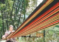是独龙族妇女手工织的毯子,它的原材料是山上野生的和自己种植的麻, 将麻搓成线后,用多种植物的液体染成各种各样的颜色,独龙毯质地结实耐用,可防雨,也可用来作垫盖被褥一类。一床讲究的独龙毯从剥麻皮、纺线到按照图案纹线拴综,以至提综、引纬、打纬等要经过十几道工序,使用多种不同的器具。如今,身披精美的独龙毯已成为独龙人民特有的传统服饰。
