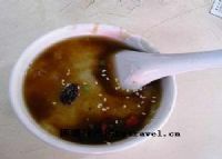 冰稀饭,用糯米煮成的稀饭,加入冰块、红糖稀、芝麻、红绿丝,搅拌后吃,糯米软而香甜,冰凉的感觉让人忘记了先前的辣,十分适合夏天吃。