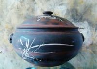 紫陶:云南省建水民间传统工艺品,始于元末明初。用建水近郊五色陶土制作成型。经过画、雕、刻、填、刮、烧炼、磨光等大道工序手工制作而成。陶器色泽深紫,花纹雪白。其中深黑嵌白者,尤为上品。建水紫陶品种繁多,有煮器具、茶具、花盆及案头陈列装饰用品等。造型大多古朴典雅,别具一格,用作蒸具,可蒸鸡、鸽等肉食品,鲜美异常。