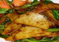 (2)特制铜锅上中火,放人猪油,下饵块丝,注入肉汤、腌菜、肉丝、咸甜酱油后用碗翻扣在锅上。听到滋滋响声,汤汁快收干时,取去豌,加入盐、豌豆尖,翻拌,下豌豆米、味精拌匀,淋人红油,出锅装碗。