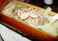 竹筒焖鸡杂,选一节老黄的竹筒,一头留节、一头开口当“锅”。将洗净的鸡肝、肫及杂碎剁碎,配以香菇、竹叶菜、青薄荷、蒜泥、草果面、核桃仁茸及食盐拌匀,全塞进竹筒中。再用芭蕉叶塞封节口,将竹筒放到炭火上翻转烘烤。待竹筒冒出油珠,使可破竹食之。奇香四溢,回味久长。
