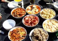 白族红白喜事宴客中的八大碗是白族传统饮食文化的集中表现。宴桌是八仙桌(正方形的大理石雕花桌),一般8个人为一桌,菜肴上8个,俗称“八大碗”。白族土八碗荤素搭配和理,肥而不腻,素而不淡,营养丰富。炸、酥、炖、煮齐全,有蒸有氽,色泽鲜艳多彩,突出白族饮食酸辣口味特色。席面用料简单,但形式和礼仪隆重,所用器皿一般是本地产的土碗、红竹筷子等,很少用高档瓷器,但并不显得粗糙和简陋。所用餐桌很考究,一般选用剑川土漆雕花八仙桌,餐桌一般摆在婚礼彩棚下,加上菜肴色泽塔配美观,显得古色古香。第一轮先由客人中有声望的老人入席,俗称“开席”。此时,唢呐鼓乐吹奏,主人迎客,气氛热闹,表现了白族尊重老人的传统美德。席间,客人可分菜和带菜回家。土八碗中的主菜(荤菜),一般都有定数,每人可吃到两块(片)肉,碗中垫底的素菜可加添多次。因此,客人都备有菜叶子(现用塑料食品袋)竹签将分到的肉包起来或串起来带回家给老人或小孩吃,寓意为带回喜气和福气>白族土八碗的各道菜各有一套烹饪方法。主菜“红肉大炖”用肥瘦相间的猪肉切块,用白酒浸泡的红曲米将肉染红炖熟,红白相间,富有喜气。“酥肉”是将半肥半瘦的猪肉切块上调料,用蛋糊包裹后下油锅炸至金黄色,冷却后在煮,,装碗后撒上些芝麻,黄白相间香气诱人。“千张肉”,即酸菜扣肉,色金红,味酸甜,肉皮呈波纹状,外观爽目。“粉蒸肉”是将较肥的五花肉煮熟切片,拌上调料和炒得喷香的米细粒,装碗上笼蒸熟,肉肥而不腻,香气缭绕。“干香”(拼盘)是土八碗中唯一的一碗凉拌菜,将卤熟的猪肉、肝、肚切片,盖在用酸菜或泡萝卜垫底的碗上,淋上又酸又辣的配汁,其味为酸、辣、凉。“煮白扁豆”、“煮竹笋”、“杂碎汤”是富含碳水化合物、植物纤维素的素菜和汤菜。