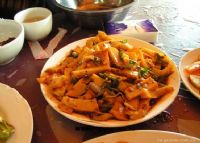 (3)装碗:将豌豆粉切成薄条入碗(传统做法是切一片放在左手掌内,右手拿餐刀把左手掌内的豌豆粉打成薄条,一面打一面入碗)。根据就餐者口味要求,用小木勺将各种调料舀入碗内,拌匀即可食用。
