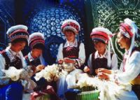 扎染古称绞缬,是由来已久的一种染布工艺,大理叫它为疙瘩花布、疙瘩花。因主产地在大理,染布者大多是白族,故尔人们又把它叫做大理扎染、白族扎染。扎染工艺出现较早,宋代《大理国画卷》所绘跟随国王礼佛的文臣武将中有两位武士头上戴的布冠套,同传统蓝地小团白花扎染十分相似,可能是大理扎染近千年前用于服饰的直观记录。到了民国时期,居家扎染已十分普遍,以一家一户为主的扎染作坊密集著称的周城、喜洲等乡镇,已经成为名传四方的扎染中心。1984年,周城兴建了扎染厂,带动近5000名妇女参加扎花,80%以上销往日、英、美、加等10多个国家和地区,供不应求。游人到了这里,可以看到妇女们个个在扎花,户户在入染,已成为重要的扎染织物产地。
