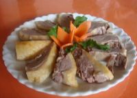 肥鹅亦可宰杀后鲜食,其味道也极佳。鹅肝、鹅掌、鹅翅,比鹅肉更为鲜美,堪称待客佳肴。尤其是鹅肝,大则重达500多克,小的也在300多克以上,被回族同胞视为是招待贵客嘉宾的上品,其味道及所含营养成分,在各种动物肝脏中名列前茅。永平腊鹅的煮法颇有讲究,得先用砂锅将水烧沸,放入八角、桂皮、草果、茴香面等佐料,然后再将切成大块的鹅肉放进锅里,用文火慢慢地炖煮。切忌用武火猛煮,否则就会变成一锅油汤。并且炖煮时要不时地添加少量的冷水,不能让汤水滚沸,否则便会口感变异,香味不纯。待炖煮约一个小时后取出,切成小块即可食用。具有味道鲜美、肉质细嫩、肥而不腻的特点,堪称是桌面菜肴中的一绝。
