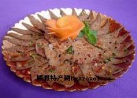 鹤庆猪肝炸是一道佐餐的荤腌咸菜。用猪肝。猪肚、猪肠子等内脏切碎加粗磨的辣椒面、花椒、八角、草果、浓盐等佐料潮腌而成,汁液成辣,鲜味香浓,摄一小碟蒸熟,一层红油飘然而出,一阵肉香扑鼻而来,引得人口水滴,用筷子挑一点尝尝,咸、辣、香,好一碟开胃的咸菜!烈日般的红色,真如白族人豪放、开朗的性格。敢吃鹤庆猪肝,才真爱白族“金花”、“阿鹏”、大爹、大妈。