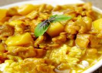 土豆煮成八成熟,滤干,去皮,切成小块,待用。洗净去皮之葱断,放入油锅内稍煎后,取出放入石槽中捣烂,盛入小碟内,待用。用凉水把咖喱粉拌和成糊状,倒入油锅内,做成油咖喱,待用。把羊肉剁成块,用适量酥油烹炒后,放入锅内加水闷煮,后加入土豆、油咖喱、盐巴、生姜、茴香、丁香、胡椒、藏寇等调料,搅拌煮熟后即成。吃时可撒上葱泥。香寨是藏族食用米饭时最佳菜肴,味美色深,调料芳香可口。