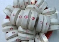 3.成型:和成的面要揉光揉好,再拧成100克左右的面蛋,揉成长条,并沿长平面中间按一条沟沟,沟沟内抹上香油,翻个身,沟沟朝下,再夹捏成17厘米左右的长条,横放,用手掌从两头压下,呈凸状,再将中间部分压成平面,即成扁平状,平面四角各按上个枣瓣(枣子去核切成四瓣),最后由两头对卷,翻身,使抹油的沟沟翻在上面,如意状的馍馍就做成了。馍馍做成之后,要摆在盘子里,冬天蒙上棉被,夏天蒙上单子,再涨(即饧发)半小时左右。