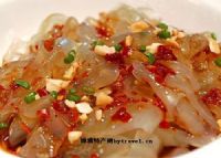又称-片皮-,入口有咸,酸,辣,香,冲等味.吃的方法都是凉拌,嚼之光滑,柔韧,自带几分凉爽.寒热皆宜,老少喜传统得粉皮子是由生长在山上的蕨菜根茎捣碎,取其淀粉加工而成.民间的制作过程是将蕨粉稀释,加微量明矾搅成糊状,舀进平底小烫锅,让烫锅浮在沸水上,随即左右旋转,让糊状浆汁均匀铺开,再放在冷开水中降温,待收汗后捞出来切成条状,色泽鲜亮,柔滑如皮条,筋丝好,有弹性.粉皮的调味非常讲究,一般都佐以少许的菠菜,豆芽,红萝卜,调入盐,醋,酱油,芥末,姜蒜汁,红油辣椒汁,及味精,颇能诱发食欲,最适合青年人的胃口.